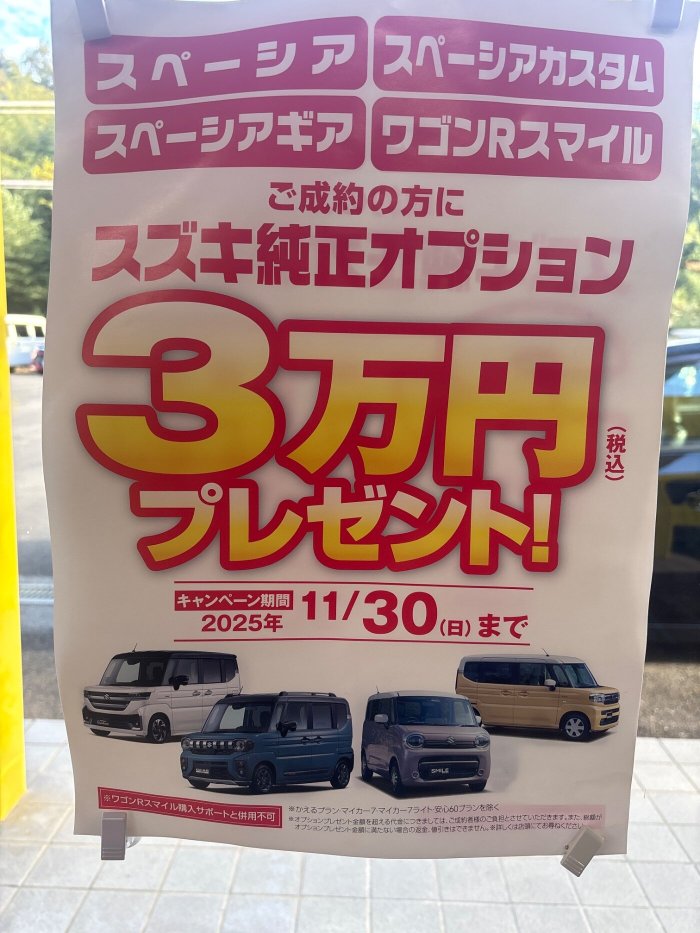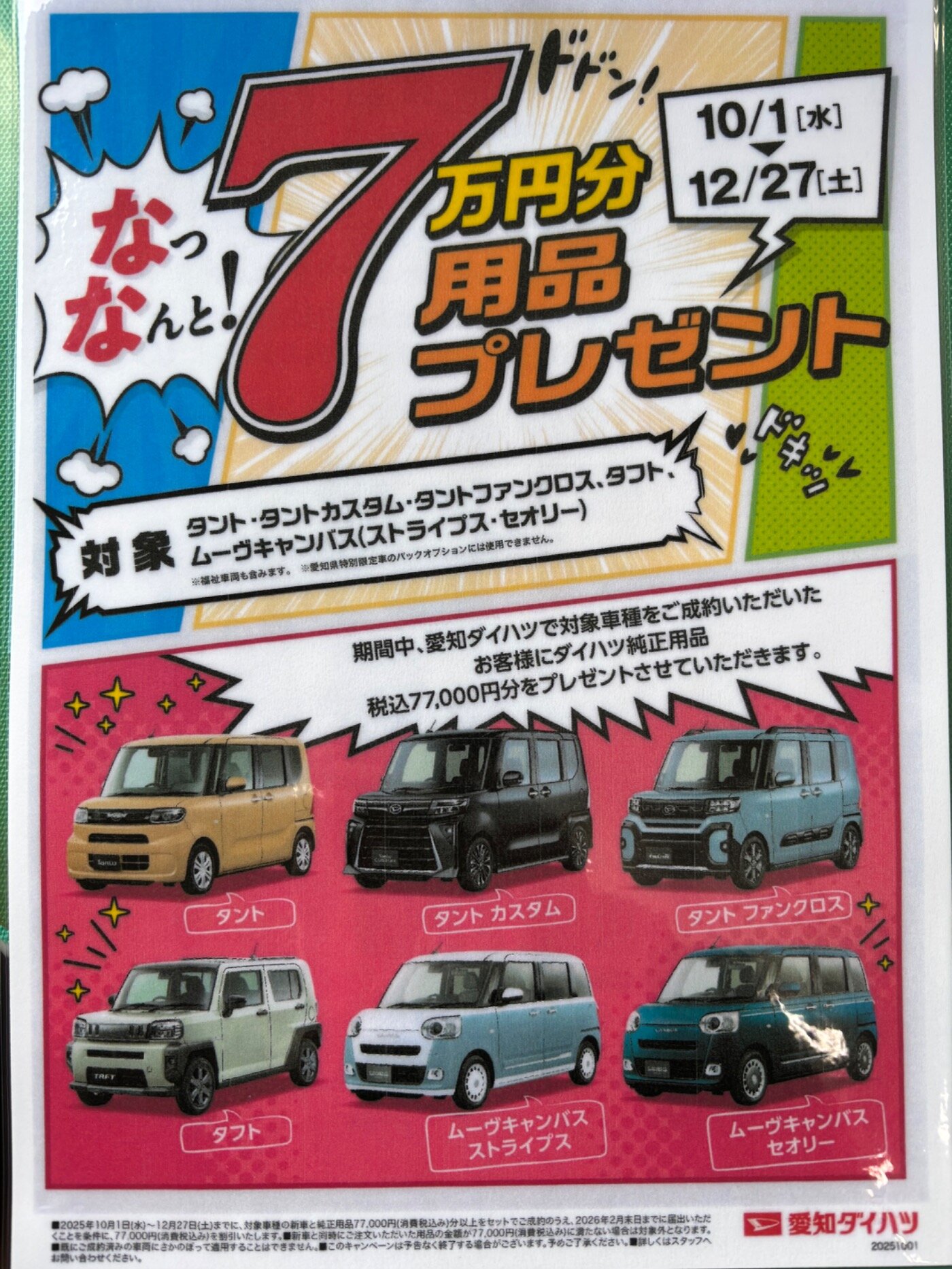 ダイハツ用品7万円プレゼントキャンペーン! 2025年11月11日(火) こんにちは!五ヶ丘店の杉浦です。 12月27日までダイハツ、7万円分用品プレゼントをやっております。 また、11月30日までスズキ、純正オプシャン3万円プレゼントをやっております。 ご検討されてる方はぜひご来店ください♪ スズキ車をご検討の方は、お急ぎください! 続きを読む Facebookでシェアする