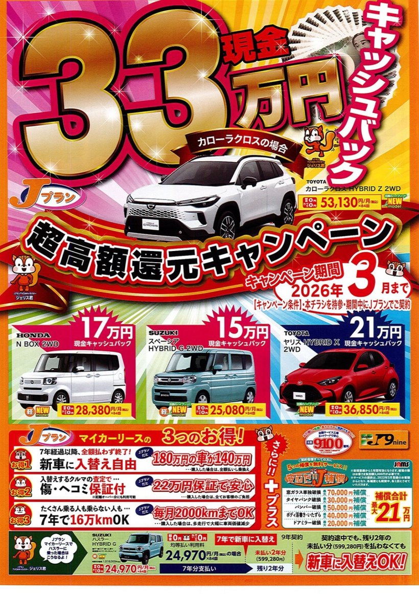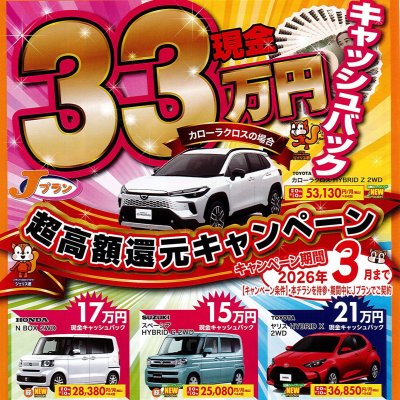 3月27日(金)まで超高額還元キャンペーン(マイカーリース Jプラン)