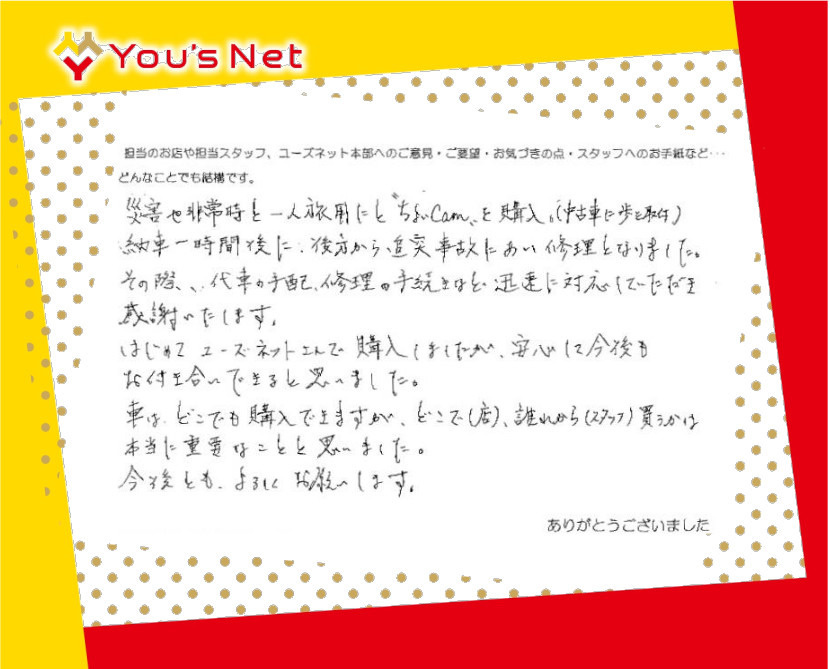 災害や非常時と一人旅用に"ちょいCam"を購入(日進市のお客様) 災害や非常時と一人旅用にと"ちょいCam”を購入(中古車に歩を取付) 納車一時間後に、後方から追突事故にあい修理となりました。その際、代車手配、修理の手続きなど、迅速に対応していただき、感謝いたします。 はじめてユーズネットさんで購入しましたが、安心して今後もお付き合いできると思いました。 車はどこでも購入できますが、どこで(店)、誰れから(スタッフ)買うかは、本当に重要なことと思いました。 今後とも、よろしくお願いします。 車名:エブリバン 担当:井上